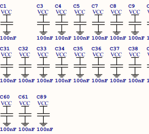 Grupo de capacitores ligados entre o VCC (5V) e GND (0V) e colocados ao lado de cada circuito integrado para minimizar a transmissão de rúido quando os integrados fazem chaveamento de sinias em alta frequência.