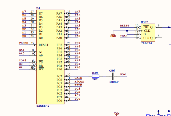 A Porta C nos 4 bits inferiores, PC0 a PC3, envia o sinal de varredura das teclas do teclado, o PC4 é para acionar o Rele de controle do motor do gravador de fita cassete, o PC5 fornece o sinal de áudio para gravação de programas na fita cassete, o PC6 aciona o LED do CAPS-LOCK e o último bit, PC7, é quem gera o som de CLICK das teclas.