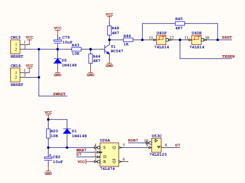 A parte de baixo da figura mostra o circuito de RESET a QUENTE que só existe nos micros MSX 2+, ele permite que o micro seja reiniciado por software sem que seja feito um teste destrutivo de medição da mémória RAM que é o normal quando se liga o computador para mostrar a quantidade de memória RAM disponível.