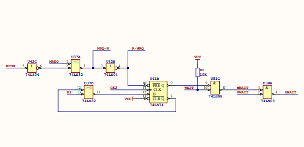 Esse circuito gera um sinal de WAIT no Z80 a cada ciclo M1. O M1 é o ciclo do Z80 que vai buscar as instruções nas memórias e normalmente é composto por 3 pulsos de clock, com o acréscimo do sinal de WAIT o ciclo M1 passa a durar 4 pulsos de clock isso para ter certeza que o Z80 poderá acessar memórias mais lentas, o normal das EPROMs.